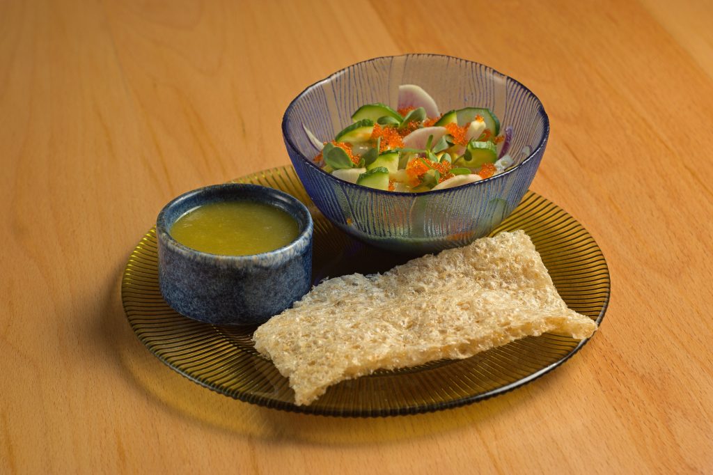 Lo nikkei en Fideo Gordo no es una etiqueta comercial. Es una vivencia encarnada en cada elemento del menú. La papada de cerdo glaseada con una salsa que cruza sambal y salsa macha. El pollo empanizado con chicharrón en vez de panko. El crudo con jurel, menta, shiso, eneldo y bolitas japonesas. El ceviche servido sobre chicharrón de cerdo con una salsa que recuerda al yuzukosho, pero con acento tropical. Y, por supuesto, los fideos: hechos en casa, de corte kishimen, cocidos en caldos densos que llevan vinagre negro, soya, semillas, chiles secos, hierbas y una generosa cucharada de memoria.