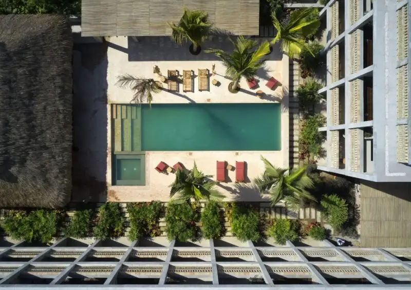 La arquitectura no grita. Concreto expuesto, ladrillo de barro, azulejo artesanal color vino, madera tropical. Materiales que envejecerán sin drama, que absorben el salitre sin protestas. Las celosías permeables de Adolfo —nombre del diseñador, dato que importa porque aquí lo artesanal no es ornamento sino estructura— crean esa porosidad necesaria: adentro y afuera dialogan sin imposiciones.