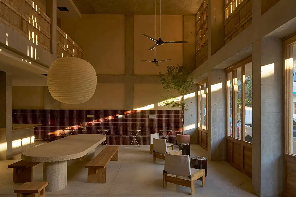 Este es el tercer proyecto de Grupo Habita en Puerto Escondido, y el único que se atreve a estar en el meollo del asunto. Mientras Escondido se esconde y Terrestre tierra adentro se refugia, Humano abraza la fricción urbana de La Punta: surfistas descalzos caminando entre restaurantes, el zumbido constante de motos llevando tablas, el multilingual básico de quienes viven del oleaje. Jorge Hernández de la Garza y Plantea Estudio entendieron la tarea: no diseñar un hotel para contemplar la cultura surf, sino para formar parte de ella.