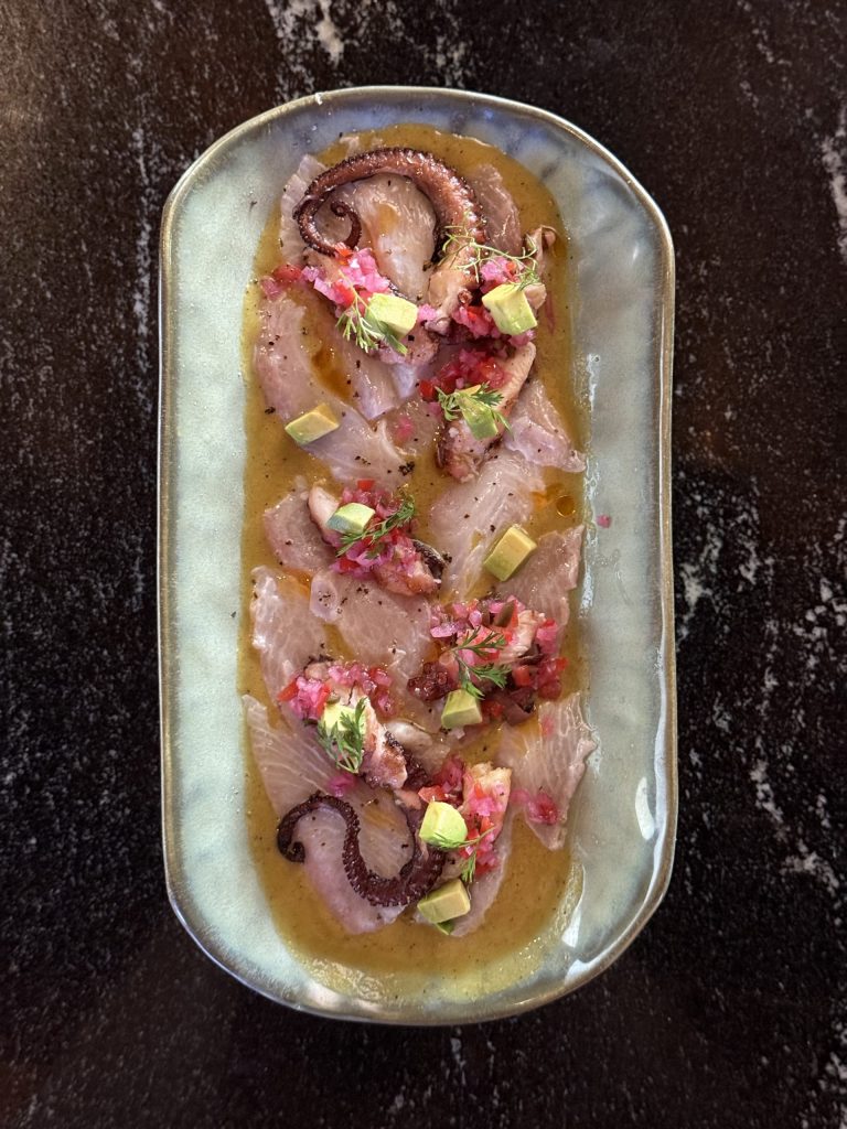 El tiradito de kampachi y pulpo, con leche de tigre de chile manzano, muestra otra cara del restaurante: la que entiende el equilibrio, la acidez, la cocción al fuego sin excesos. Aquí no hay poses, hay cocina. Y detrás, una brigada que conoce su técnica y cuida el ritmo del servicio sin error.