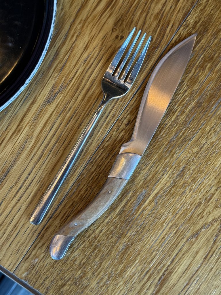 Y justo aquí vale hacer una pausa importante: el tipo de cuchillo que se entrega al comensal no es un accesorio, es una declaración. Prime Steak Club ofrece cuchillos lisos de hoja limpia, como los grandes asadores del mundo. Nada de sierras de dentado barato que desgarran la carne y esconden errores de cocción. Un corte bien hecho no se pelea con el cuchillo: se desliza. Que lo sirvan así, con herramientas correctas y sin show innecesario, habla de respeto por el oficio.