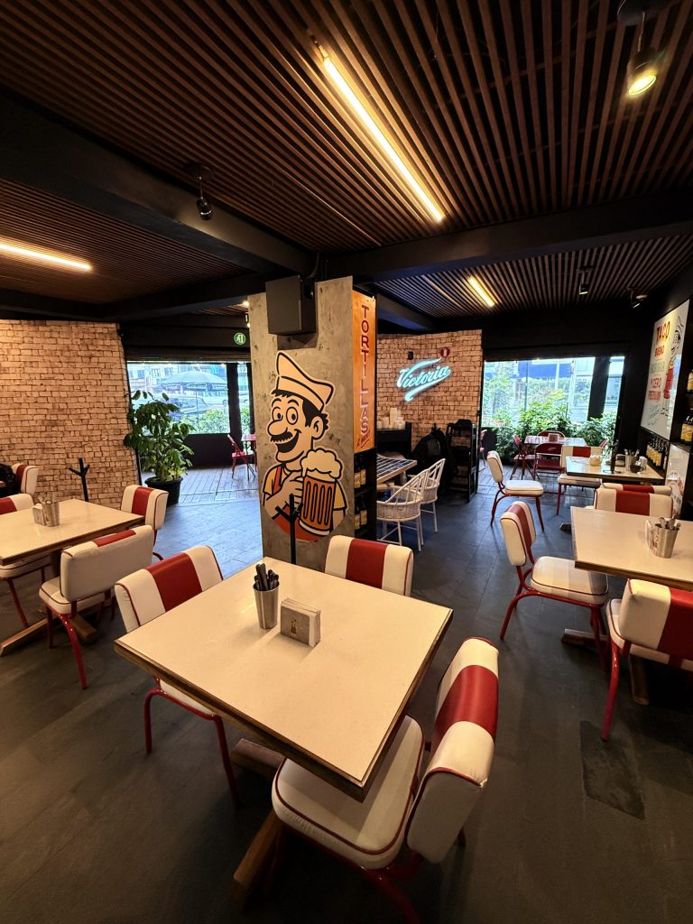 ¿El espacio? Una fuente de sodas sesentera, tapizada con caguamas Victoria y nostalgia calculada. Limpio, retro, sin caer en el simulacro. Una taquería con pasado inventado y futuro asegurado.