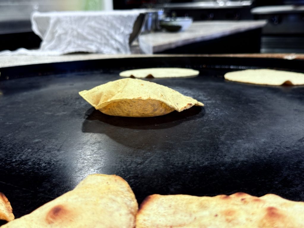 El trompo —esa mezcla improbable de sirloin con picaña Wagyu Cross— es un acto de fe en la grasa intramuscular. La grasa de la picaña se derrite sobre el sirloin y le presta su suavidad, lo vuelve un taco que no se muerde, se rinde. El resultado es un sabor profundo, limpio, que hace que el trompo de sirloin de la competencia parezca un juguete.